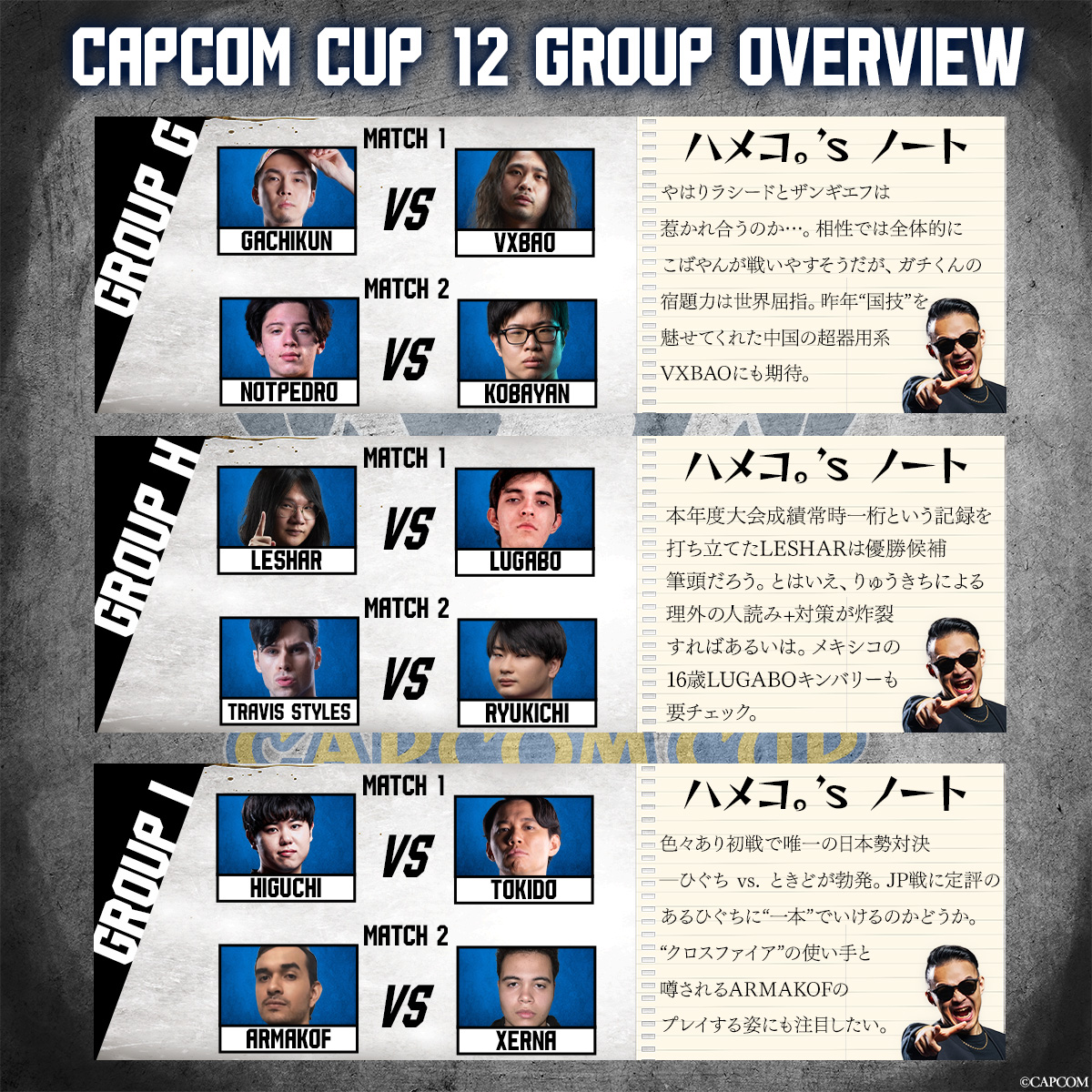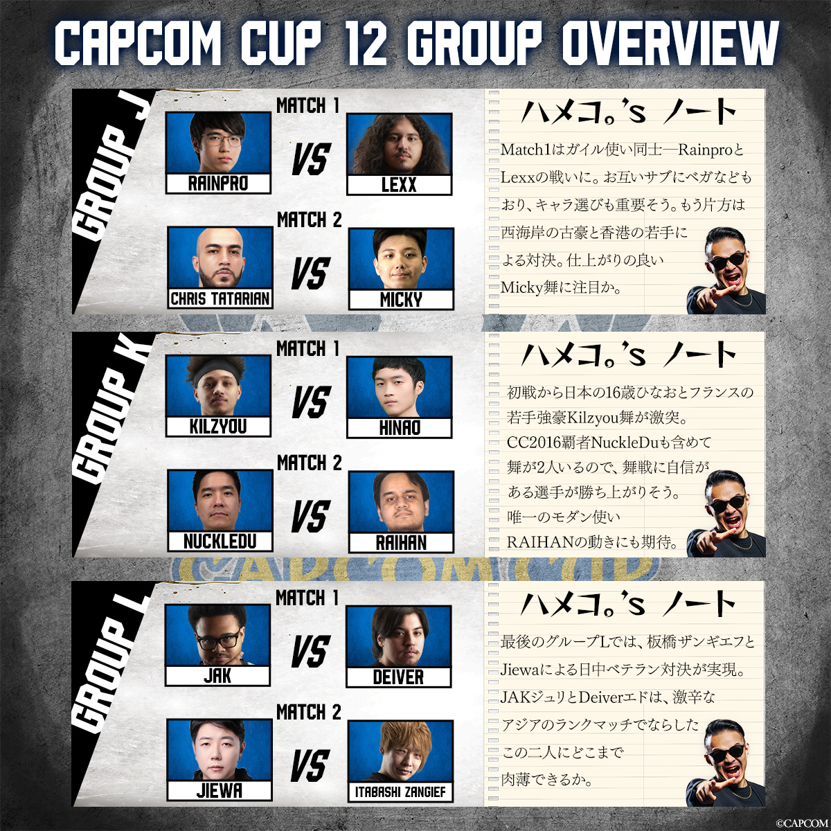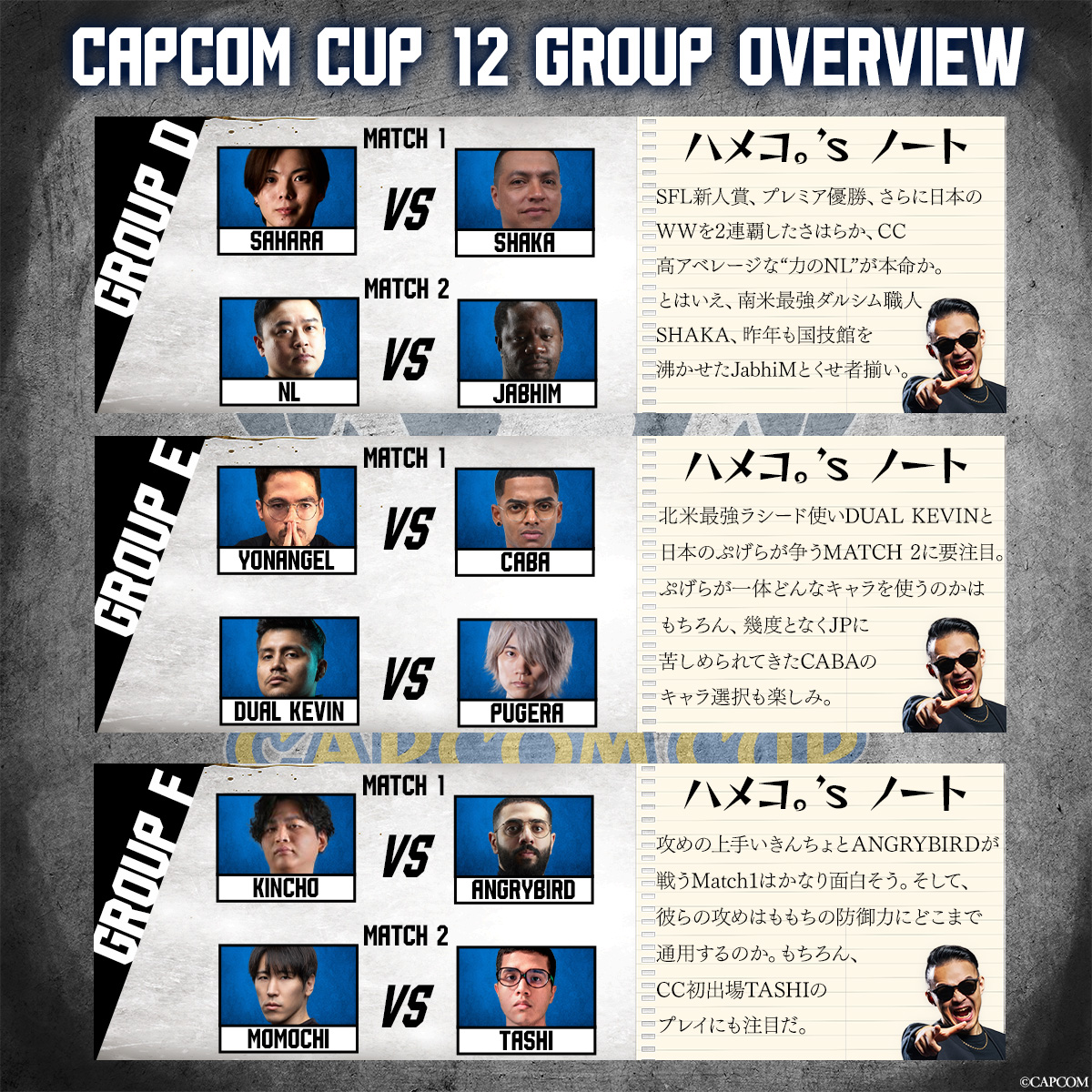 "fullText": "【CAPCOMCUP】\n\n"どう見てもこれがグランドファイナルだろ…"などと、誰もが結論を急ぐ試合が初日から展開。\n\n世界最高峰の対戦格闘ゲームイベント「ストリートファイター6 "CAPCOM CUP 12 & ストリートファイターリーグ: ワールドチャンピオンシップ 2025"」配信中\n\n▼本配信\n・日本語実況 YouTube\n( https://youtube.com/live/6Y6Zy77agPc )\n・日本語実況 Twitch\n( https://twitch.tv/capcomfighters_jp )\n・英語実況 YouTube\n( https://youtube.com/live/Fa2MQI9PAz8 )\n・英語実況 Twitch\n( https://twitch.tv/capcomfighters )\n\n▼ミラー配信(Day1~Day3まで申請なしでミラー可能)\n・Shuto\n( https://www.twitch.tv/shuto_fgc )\n・ネモ\n( https://www.twitch.tv/nemo_good )\n・ACQUA\n( https://www.twitch.tv/acqua_0316 )\n( https://www.youtube.com/watch?v=DWaz4HS60VQ )\n・もけ\n( https://www.twitch.tv/lllmokelll )\n・sako\n( https://www.twitch.tv/sakonoko_game )\n・かずのこ\n( https://www.youtube.com/watch?v=8lo16Ce7Z20 )\n・なるお\n( https://www.twitch.tv/naru0419045 )\n・こく兄\n( https://www.twitch.tv/kokujintv )\n・YAS\n( https://www.twitch.tv/yas_jittyoku )\n( https://www.youtube.com/watch?v=9EYhDHgBkbU )\n・SHAKA\n( https://www.twitch.tv/fps_shaka )\n・アルランディス\n( https://www.youtube.com/watch?v=pCoYepxvnE8 )\n・takera\n( https://www.twitch.tv/takera0628 )\n・折咲もしゅ\n( https://www.twitch.tv/moshu_orisaki )\n( https://www.youtube.com/watch?v=wZC0c-SKnzo )\n・星鳳ともり\n( https://www.youtube.com/watch?v=xKHYbXr13Uc )\n・永井浩二\n( https://www.twitch.tv/nagaikouji074 )\n・Punk\n( https://www.twitch.tv/punkdagod )\n\n▼プレイヤー情報\n・CCグループA、B、C\n( https://pbs.twimg.com/media/HCpRNQCasAA1yj5.jpg )\n・CCグループD、E、F\n( https://pbs.twimg.com/media/HCsJiYwaUAIPMbY.jpg )\n・CCグループG、H、I\n( https://pbs.twimg.com/media/HCzJH6yasAAqsAC.jpg )\n・CCグループJ、K、L\n( https://pbs.twimg.com/media/HC3M0iPbYAA1pRJ.jpg )\n・SFLWC\n( https://pbs.twimg.com/media/HBAudPMbgAEkmcS.jpg )\n\n▼大会ルール\n( https://youtube.com/watch?v=pHnxmY8SwEk )\n\n▼スケジュール\n・[無料]3月11日(水)11:00~ CCグループステージDay1\n・[無料]3月12日(木)11:00~ CCグループステージDay2\n・[無料]3月13日(金)11:00~ CCグループステージDay3/SFLWC予選1日目\n・[SPWN有料/バトルハブ無料]3月14日(土)11:00~ CC TOP16~決勝\n・[SPWN有料/バトルハブ無料]3月15日(日)10:00~ SFLWC予選2日目+決勝\n・[無料]3月29日(日)16:00~ SFLWC予選2日目+決勝(大会後公開の再編集版)\n・[無料]3月30日(月)7:00~ CC TOP16~決勝(大会後公開の再編集版)\n\n▼公式サイト\n( https://sf.esports.capcom.com/capcomcup/cc12/jp/ )\n\n▼SF6アップデート情報\n・2026年3月17日(火)16:00~\n └遅れてきた真の主人公「アレックス」実装\n └全キャラバランス調整\n └ディージェイとエレナの水着Outfit追加\n └その他未定(ハイタニ先生のまねもん?、イラストコンテスト入賞作品の乱入演出?など)\n( https://store.steampowered.com/news/app/1364780/view/247268204255117318 )\n( https://youtube.com/watch?v=_1UuCPYcWpM )\n( https://youtube.com/watch?v=6uyM6dTLK3E )\n( https://game.capcom.com/cfn/sfv/column/130740 )\n・2026年春前半\n └カプコンファイティングオールスターズとかいう幻のゲームのキャラ「イングリッド」実装\n( https://prtimes.jp/main/html/rd/p/000005108.000013450.html )\n( https://game.capcom.com/cfn/sfv/column/130385 )\n・アレックスとイングリッドで遊べる現行タイトル(実質先行プレイ)\n └アレックス:アニコレ収録のSF3シリーズ、SF5、ファイコレ2収録のカプジャム\n └イングリッド:ファイコレ2収録のカプジャムとZERO3アッパー\n\n▼公式X\n・CAPCOM eSports\n( https://x.com/CAPCOM_eSports )\n・ストリートファイター\n( https://x.com/StreetFighterJA )",